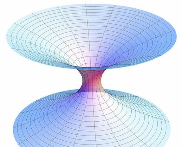我们可以把黑洞想象成是一个拥有很长颈部的大漏斗。如果你“切断”它的颈部,把它与第二个黑洞连接在一起,你就会得到一个沙漏形状的结构,两端通过一根细丝相连。从学术上讲,这根细丝被称之为爱因斯坦-罗森桥(是由爱因斯坦及其同事纳森-罗森命名的),这是虫洞的早期理论化身。一些物理学家已经非常擅长模拟黑洞的信号行为,至少从数学的角度而言。例如,乌尔夫-莱昂哈特和英国圣安德鲁大学的一帮人已经利用激光脉冲和光纤制成与黑洞类似的物体。威廉-昂鲁与英属哥伦比亚大学的科学家合作,已经制成视界的水波版本,以及被他称之为“哑洞(dumb holes)”的音速的类似物。