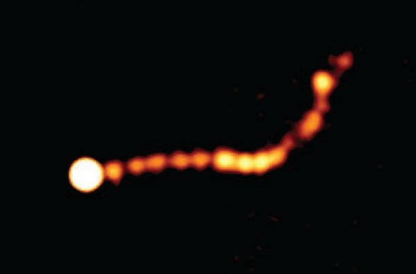 来自澳大利亚新南威尔士州的综合孔径射电望远镜阵列(ATCA)的最新观测数据,显示了一个200万光年的奇异结构,科学家将其编号为“PKS 0637-752”,推测该长条型的结构由星系中的超大质量黑洞所释放的喷流,对该喷流中的物质速率测量结果显示,其运行速度几乎接近了光速,绵延长达百万光年。从外观上看,酷似超音速战斗机加力燃烧室里的喷射流运动,只不过其动力来源于黑洞。本项研究的结果已经发表在《天体物理周刊》杂志上,显示了星系中央超大质量黑洞释放的“明亮”喷流以及黑暗区域,形似加力燃烧室的喷射流体。