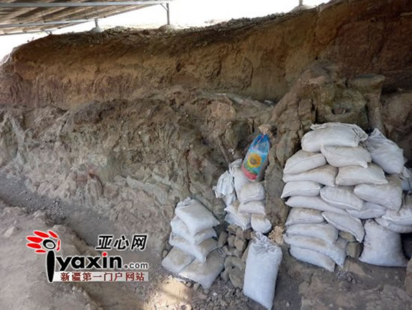 新发现的国内最大侏罗纪恐龙骨骼化石。堆积的沙袋,是防止坍塌采取的保护措施。