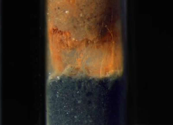 从海床层细小的间隙中清晰的展示了无数的导线状细菌。电流通过这些细菌传导在红色表层以及底部黑色厌氧层之间。