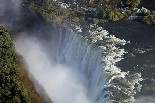 假如你在从维多利亚瀑布机场(Victoria Falls Airport)去往维多利亚瀑布酒店(Victoria Falls Hotel)的途中闭上双眼,在你被安全护送到酒店殖民时期修建的围 内时才睁开眼睛,你仍有可能像很久以前的游客那样“邂逅”附近的瀑布。坐在酒店后院的游廊中,小酌一口烈酒,视线越过草坪,便可观赏到前方峡谷下跨越赞比西河(Zambezi River)的铁桥。再往远处便是大片大片浓重的水雾,弥漫在空中足有数百英尺高。出了酒店的后门,便是一条通向公园入口的泥土小道,这条小道常常被狒狒占据着,有时候非洲大羚羊也会光顾。从公园里看去,维多利亚瀑布气势宏大、壮观,让人完全沉醉其中,直到浑身被溅湿、冷得浑身发抖了,你才会从那里逃离,重新回到太阳底下、回到小道上、然后回到酒店的游廊中。我在游廊上与克里斯坦森遇见了他有好几年不见的一名前游猎向导──蒙延伊瓦(Blessing Munyenyiwa)。他在国家公园中受过训练并获得了执照,曾经和克里斯坦森一样离开了津巴布韦,但如今他已经回国在这家酒店工作。