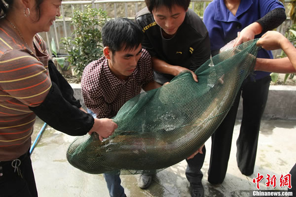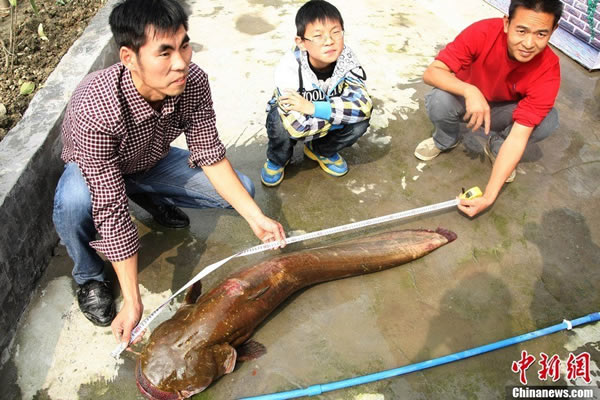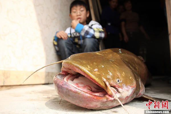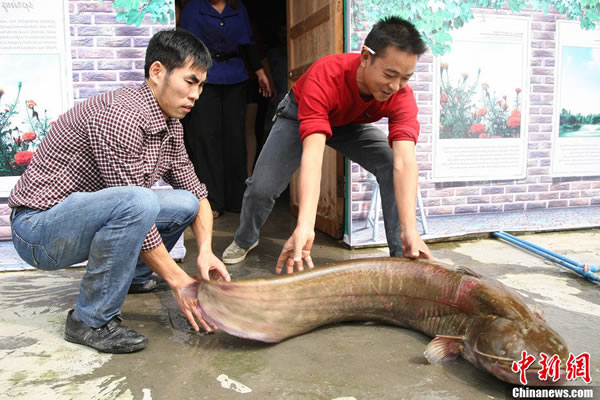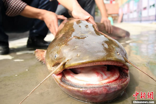 重庆黔江区一名钓鱼爱好者日前在黔江阿蓬江垂钓,竟钓起一条45斤重的野生“鲶鱼王”,这在鲶鱼界实属罕见。当地一家鱼庄老板以2700元的价格买下该“鲶鱼王”,作为“镇店之宝”供客人观赏,这使众多市民慕名到该鱼庄就餐。重庆渔政部门表示,鲶鱼非野生保护动物,垂钓者又是以正常捕鱼手段捕获,因此渔政部门不能强行解救。不过专家称,人工饲养难以符合野生鲶鱼的野生环境,极易使鱼生病,因此建议鱼庄老板尽快将“鲶鱼王”放生。
