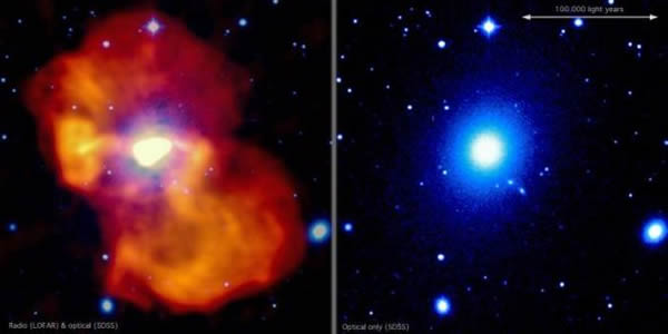 据物理学家组织网站报道,正如生物的共生现象相似,星系和它中央的黑洞之间存在着紧密联系,共同演化发展。天文学家们对于这种共生关系目前仍然有很多地方不甚了解。有一些黑洞处于活跃状态,不断吞噬物质。这些下落的物质中有一部分并没有被吞入黑洞,而是被反弹回来,以一股细长的流体形式向外喷射,速度接近光速。当这股喷流的速度逐渐减下来之后,它就会形成一个稀薄的巨大球体,其大小甚至足以放进一个星系。这个巨大的“气泡”在可见光波段是看不到的,然而在射电波段却非常明显。而最近由荷兰射电天文研究院(ASTRON)通过国际合作努力建成的LOFAR望远镜就非常适合观测这类低频率天体目标。