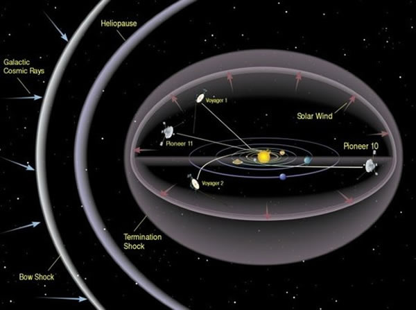 当太阳系围绕银河系核心公转时,其产生的磁场也会随之运动,并形成了一个被称为“日球层”的泡沫,可以将太阳系内的行星、探测器以及我们人类都“包裹”其中。直到最近,旅行者1号及其姊妹探测器旅行者2号也依然处于太阳系的内环境中,这两个探测器探测到来自太阳的高能粒子和“感觉”到太阳磁场,此刻旅行者1号探测器离太阳的距离已经达到122个天文单位,该距离为冥王星到太阳平均距离的三倍,地球发出的信号抵达探测器需要17个小时。