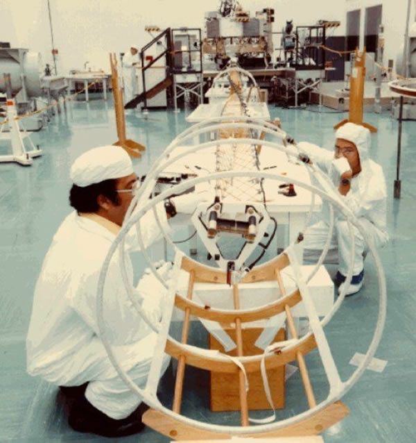 旅行者1号探测器位于装配车间内的情景