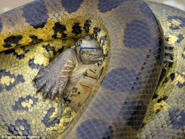 据61岁的法国摄影师Jean-Michel Labat介绍,当这条大蟒蛇盯上这只小乌龟并用长长的躯体将其仅仅包裹住进行压缩时,他以为这只乌龟的小命恐怕不保。可令他没想到的是,这只小乌龟表现出勇敢的姿态,用力与这条庞然大物抗争了数分钟,这完全得益于它坚硬的外壳。