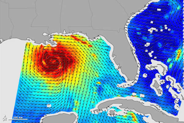 上面这两幅风图说明了飓风桑迪(上)和飓风卡特里娜(下)之间的一些差异。在这两幅图中,风速超过每小时65公里的用黄色表示,风速超过每小时80公里每小时的用橙色表示;风速在 95 公里每小时以上的用暗红色表示。