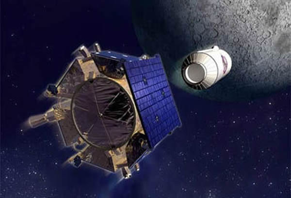 示意图:正在高速撞向月球的LCROSS撞击器以及半人马座上面级