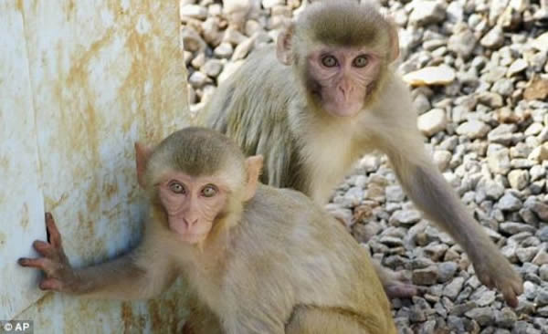 参与研究的两只恒河猴。科学家对恒河猴进行训练,完成在两点之间移动眼睛的任务,时间间隔为一秒,同时观察它们的大脑活动