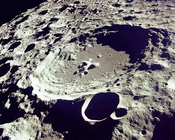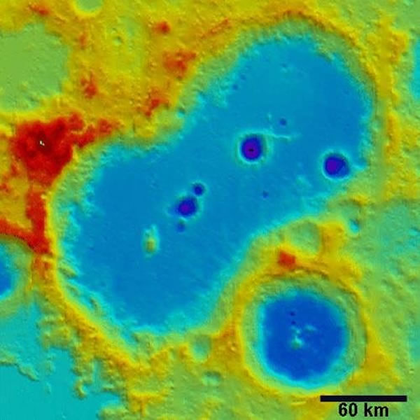 这张范德格拉夫的假彩照片展示的是一个有趣的数字8的形状。它位于月球背面南极艾特肯盆地的北面。这个陨坑看起来就像是由两次单独的撞击产生的。然而美国宇航局注意到没有陨石坑岩壁将它一分为二。这一区域也有着更强浓度的放射性物质,这一区域的另一个神秘是它拥有一个局部的小型磁场,或许是由于表面下的火山岩导致的。