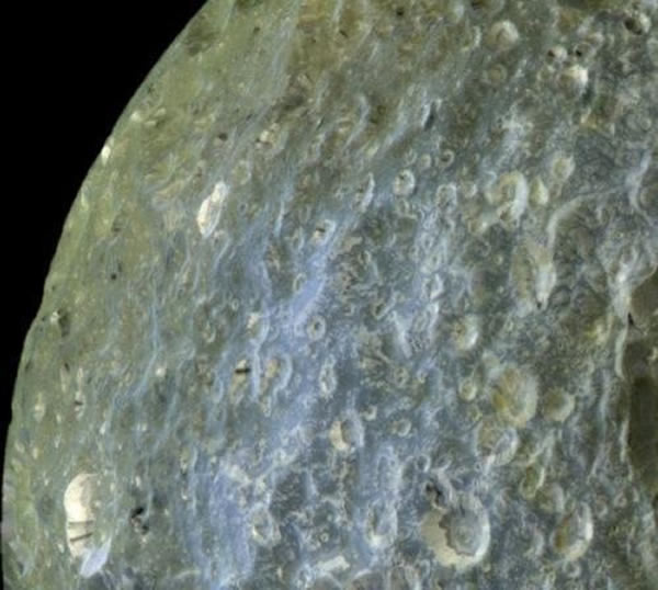 地球的月球只是我们太阳系中遭受撞击的卫星之一。这张假彩照片是美国宇航局卡西尼号太空船拍摄到的土卫一号。美国宇航局指出了土卫一表面色彩如何变化,包括右侧的浅蓝色地带和其它的绿色地带。