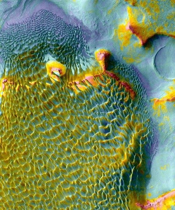 火星接近太阳系小行星带的位置让它非常容易成为太空物体的撞击目标。从照片中我们能看到拉贝陨坑的一连串沙丘。拉贝陨坑是被德国天文学家威廉-F-拉贝发现的,它的直径为108公里而且位于火星赤道和南极的中间。