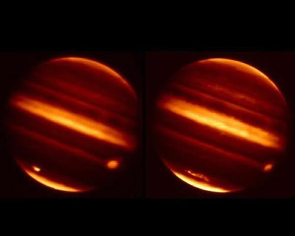 科学家们认为木星的引力阻止了火星和它之间形成一颗行星。相反的是小行星相互之间的碰撞创造出我们太阳系的小行星带。这张照片拍摄的是2009年一颗泰坦尼克号大小的物体撞击撞击木星之后的场景。正如美国宇航局所做的解释:“左侧的照片拍摄于2009年7月20日,右侧的照片拍摄于2009年8月16日。撞击和撞击的后果能够在照片中明显的看到。”
