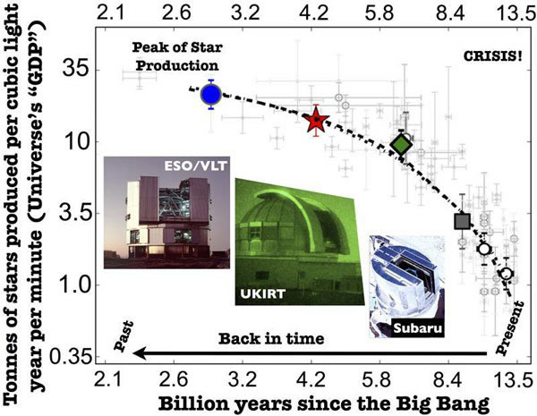 该图显示了过去宇宙的“GDP”的变化。新的研究结果表明,通过计算质量,恒星形成的速率自110亿年前达到峰值后,已下降了97%。