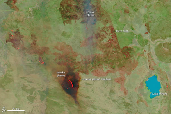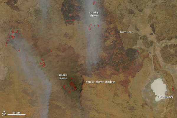 2012年9月,冬末春初之际,澳大利亚北领地(Northern Territory )野火肆虐。9月18日,美国宇航局的Aqua卫星上的中分辨率成像光谱仪(MODIS)观察到澳大利亚伍兹湖(Lake Woods)西部地区的烟雾和大火,并采用不同的方式拍下了上面这两幅照片,其中第一幅是自然色照片,第二幅是伪色照片。