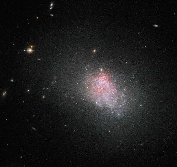 这张图像由美国宇航局哈勃空间望远镜拍摄,显示的是暗弱的不规则星系NGC 3738。这个星系正经历剧烈的恒星新生过程,这一点可以从该星系周遭发出红光的氢气云中获得证据