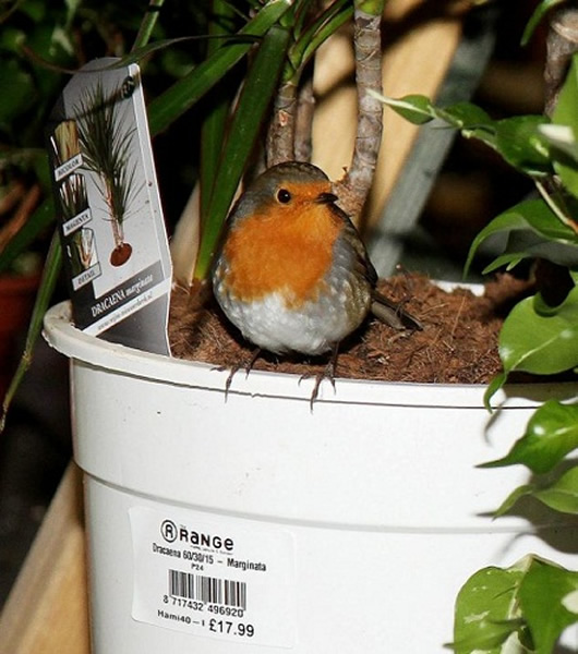 商店员工表示,这只知更鸟通常趁商店大门打开时飞进商店,进入商店后,便落在花盆或剪草机上,吸引顾客喂食,而顾客们通常都会抓一点商店里出售的自选鸟食喂它。