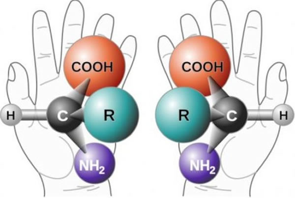 氨基酸的手性示意图,左旋和右旋氨基酸分子如同在“照镜子”
