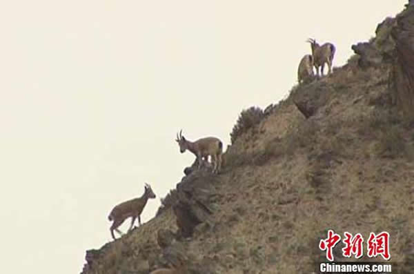新疆和静县境内的开都河中游的天山大峡谷出现成群的北山羊在山坡上悠闲的吃草,数量最少在20只以上,专家称可能与当地加强野生动物保护有关。