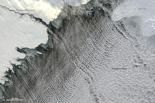 美国宇航局地球观测站公布了一张卫星照片,展示了加拿大哈德逊湾(Hudson Bay)上空的云街景象。