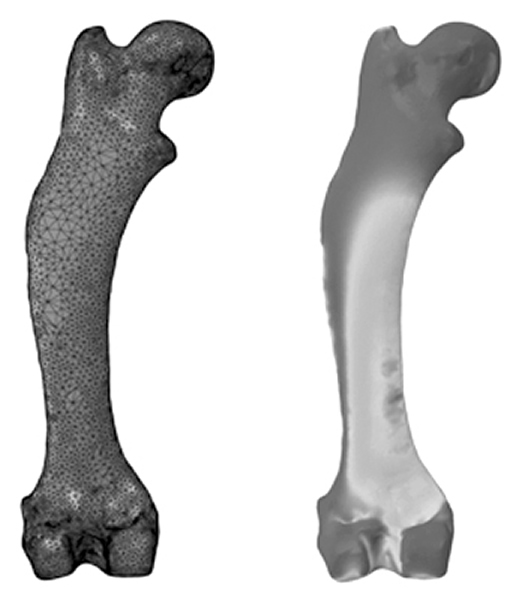 图中展示的是一只刺猬属欧洲刺猬的大腿骨模型,旁边的一个版本则展示了弯曲造成的应力,深色区域代表高应力。