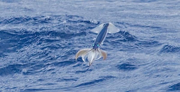 日本飞行鱿鱼并非唯一像水动力火箭在空中飞行的动物,但是这种跃出水面在空中飞行的行为并不安全,时常暴露在信天翁等鸟类的视线之下,很容易被吞食。