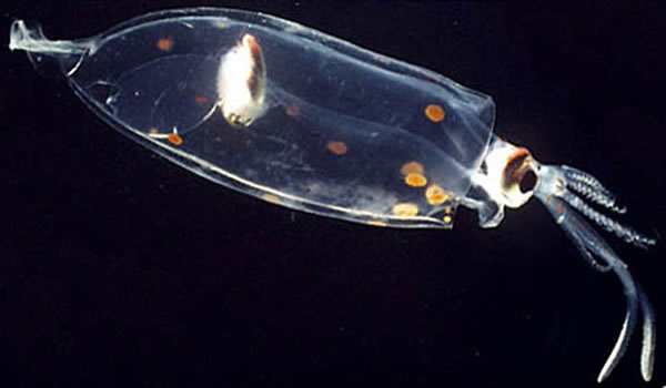 玻璃鱿鱼是鱿鱼物种的一个分支,它们拥有透明身体,其中最为独特的是Cranchia Scabra,该物种具有半透明筒状身体,身体上覆盖着数十个结节突起。
