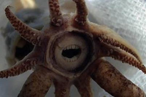 鱿鱼长着坚硬锋利的喙,用于咬碎咀嚼食物,Promachoteuthis Sulcus也不例外。图中所示是它们可怕的牙齿吗?事实上这仅是嘴唇,喙部真正潜藏在后方。
