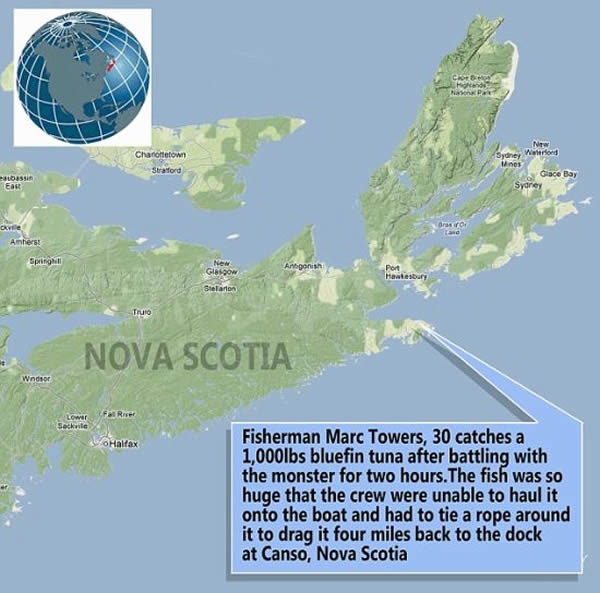 一起进行垂钓旅行的托沃斯和库克决定造访新斯科舍省的原因是想捕捉一条蓝鳍金枪鱼。蓝鳍金枪鱼的纪录保持者是肯恩-弗雷泽。1979年他在新斯科舍省海岸附近捉到一条1496磅(约合678公斤)重的蓝鳍金枪鱼。