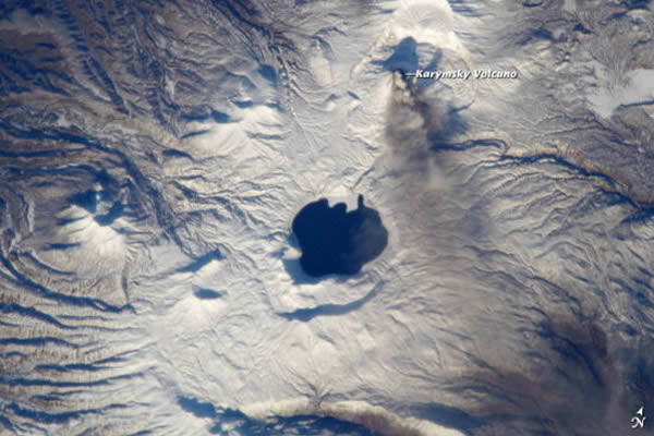 这幅照片是宇航员在卡丽姆斯卡火山开始爆发后约1小时35分钟后拍摄的。在照片中可以看到,火山灰尘柱从卡丽姆斯卡火山山顶向东南飘去,而下面的积雪因为被棕色的火山积灰覆盖而变得黯淡无光。