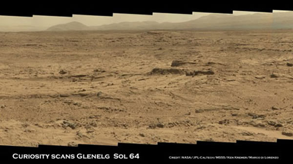 “好奇”号桅杆相机拍摄的“格雷尔”地质区域的全景图。背景是盖尔环形山起伏的边缘以及夏普山的山麓。