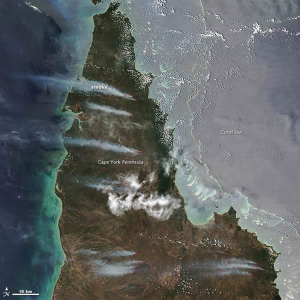 2012年11月25日,NASA的Aqua卫星上的中分辨率成像光谱仪(MODIS)拍下了这幅照片,显示了澳大利亚最北端的约克角半岛上的野火火灾。多处大火导致的浓烟向西飘去;红色的轮廓线标出了MODIS检测到的表面温度异常高的地方。