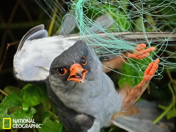 在印度北部,一只阿穆尔隼正在网中挣扎。