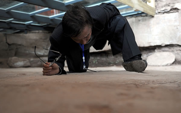 来自韩国的恐龙研究专家许民在綦江老瀛山莲花保寨查看恐龙足迹