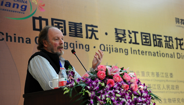 来自美国科罗拉多大学丹佛分校恐龙追踪者团队的马丁·洛克利,在綦江国际恐龙足迹研讨会上发表演讲