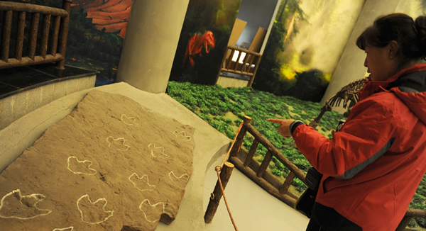 外国专家在綦江博物馆地质厅参观恐龙足迹标本