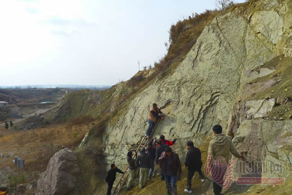12月2日,古生物专家在山东岌山省级地质公园内考察鉴定恐龙足迹化石