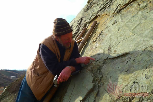 著名古生物专家、美国科罗拉多大学恐龙足迹博物馆馆长马丁·洛克利在岌山省级地质公园内考察鉴定“驰龙”足迹化石