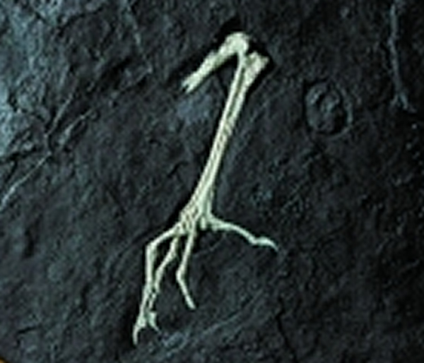 张氏三水鸟右侧后肢化石(eeook.com)。这件鸟类后肢化石保存了鸟类右侧胫跗骨远端、完整的跗趾骨和四只爪,其中跗趾骨长度为64毫米、宽为10毫米。