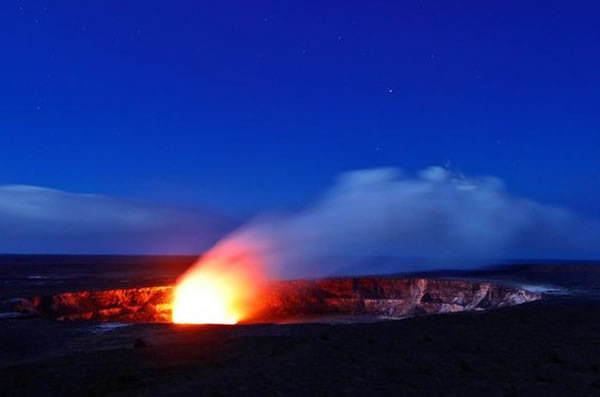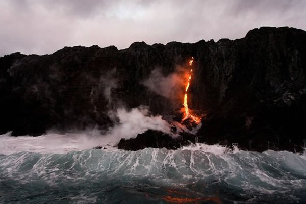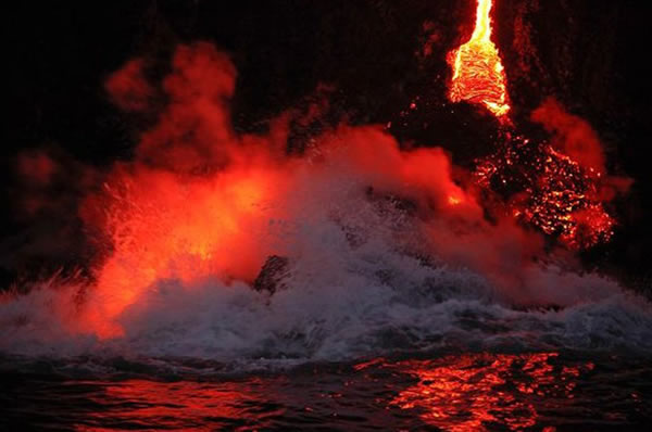 图片是位于美国夏威夷岛东南部的基拉韦厄(Kilauea)火山爆发喷出的熔岩流入大海时发生的壮观自然景象,当海水与熔岩交汇时产生大量的羽状蒸汽。虽然从附近大岛上的夏威夷国家火山公园卡拉帕纳(Kalapana)也能看到火山熔岩喷发的景象,但是这种火山岩浆流进入海口的壮观是难得一见的。