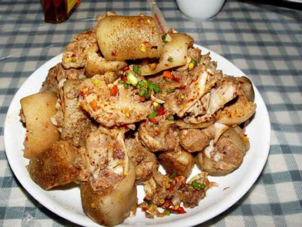 彝族风味菜,即肉冻。这是彝族地区较为讲究的一种菜肴。它采用猪蹄和肘子制做而成。一般做法是将肉放入锅内煮软后捞起,剔去骨头并将肉宰碎,放上木姜、生姜、花椒等佐料,有的还放橘子皮,或鸡蛋之类的东西,然后放回锅里煮上一阵,以便使佐料渗入肉中,最后放入木钵内,放上一夜即成。肉冻柔软可口,香味独特,是彝族十分喜爱的一种食品。