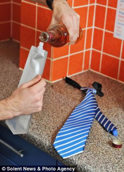 “酒瓶领带”的内置水袋可装下284毫升的酒