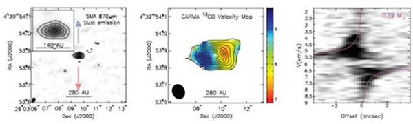 通过测量盘状物内一氧化碳的无线电波,天文学家们发现,处于不同距离的物质围绕该恒星转动的速度变化,和太阳系中处于不同距离的行星围绕太阳转动变化方式相同。