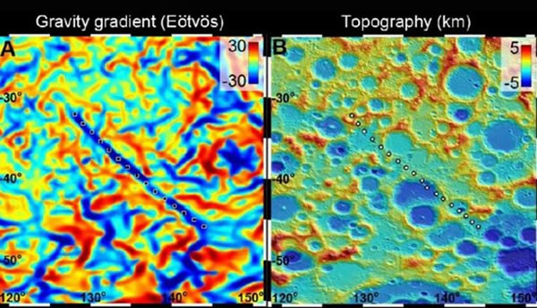 但是对于两个月亮碰撞假说,科学家玛丽亚·朱伯认为在高分辨率的重力地形图上并没有发现碰撞的证据。对月球重力场绘制探索任务将在本月晚些时候结束,两艘重力回溯及内部结构实验室A和B将撞击月球表面。图2中显示的是长度达300英里(大约为500公里)的线性重力异常分布区,为了测量重力异常分布,两艘探测器分别在月球的另一边进行测量,并绘制出重力梯度。