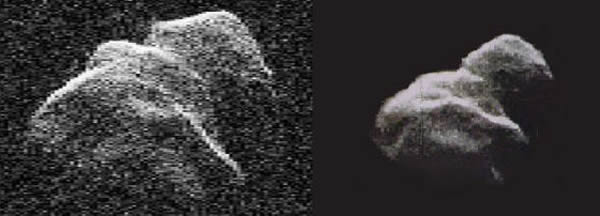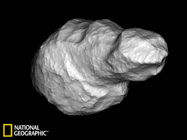Toutatis的形状看起来就像一颗多瘤的花生,从某些角度看,更像个造得很蹩脚的雪人。它中间长而窄,两侧是大小不等的突出物。布希的研究发现,小行星不仅外形古怪,其质量分布也呈现出很不均匀的特征。他补充道:“它可能具有十分复杂的内部结构。”