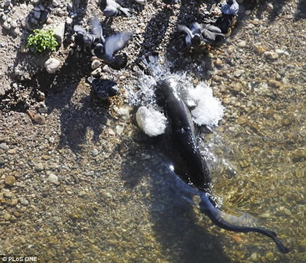 在为期5个月的观测中,研究人员发现了54次鲶鱼攻击鸽子事件,成功率为28%