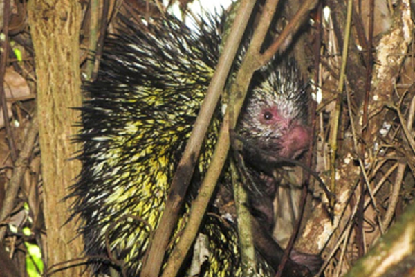 除了小耳鼩 ,秘鲁的丛林中还生活着另一个新物种,这就是“神秘豪猪”。不过这一名号有些名不副实,因为它比一般的豪猪体型大很多,颜色深很多,身上的刺也长很多。对于当地人来说,这种豪猪一点也不神秘,毕竟外形上是如此的显眼。