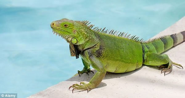 游泳池旁的一只鬣蜥蜴,当时小行星碰撞幸存的蜥蜴和蛇类物种经过数千万年进化,形成现今9000多个物种