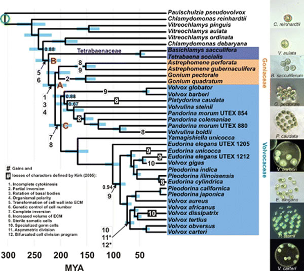 团藻属及其亲缘物种组成的“团藻”显示出了一大批合作性质的结合——从嵌入到一个粘性基质上的4个细胞到由5万个细胞组成的球形的、由鞭毛推动的团藻。此前的研究确定了团藻的分化时间是在大约5000万年到7500万年前,但是这个结果是根据单个基因以及单个化石的校正。