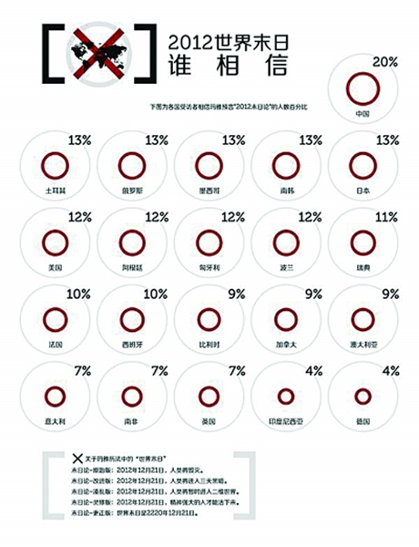 日前,著名咨询公司益普索调查了21个国家的民众对世界末日的看法,结果显示中国、俄罗斯、韩国、日本、美国、波兰等国家约有10%以上的民众相信玛雅历法,比利时、加拿大、意大利、英国和德国只有不到10%的人相信。